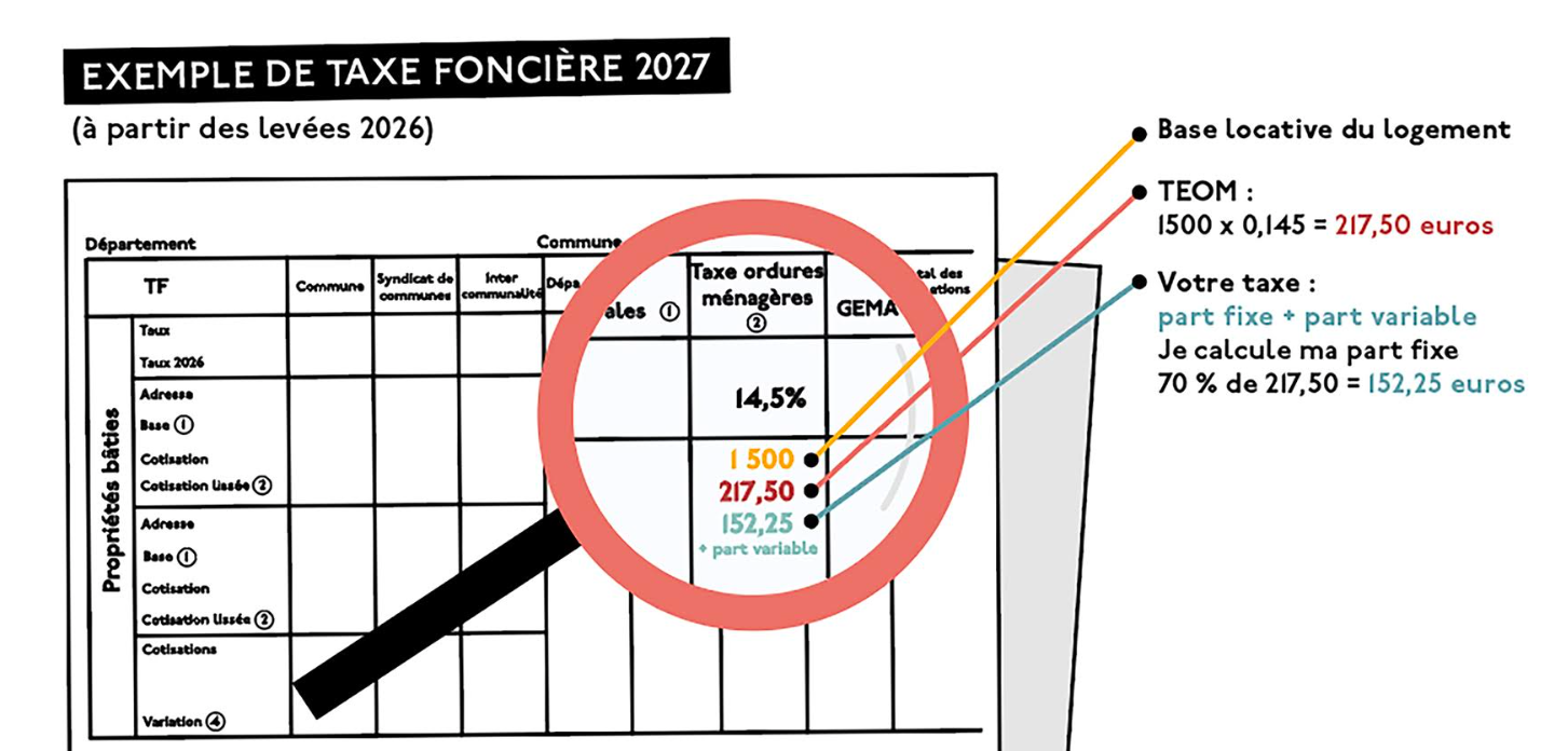 Depuis le 1er janvier 2026, la Taxe d’Enlèvement des Ordures Ménagères Incitative (TEOMI) remplace la Taxe d’Enlèvement des Ordures Ménagères (TEOM). Cet impôt permet de financer la collecte et le traitement des déchets ménagers. Elle est payée chaque année par les propriétaires, via la taxe foncière.